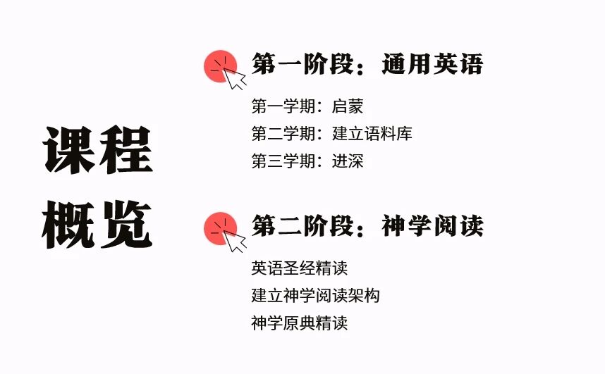 课程描述:帮助在英语上零基础的朋友,经过第一阶段(基础部分)的学习和训练后,可以基本具备用英语直接上手阅读English Bible(NIV水平)和神学英语原典的能力。具体安排:(请见下图)